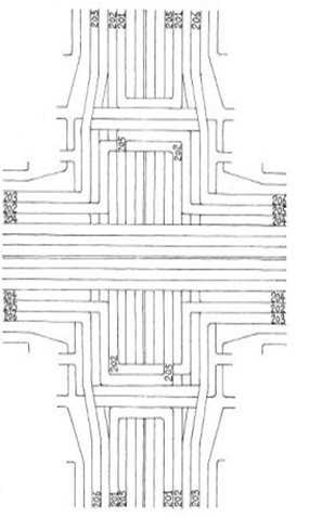 左轉(zhuǎn)彎車道的三層立交設(shè)計(jì),兩橫向左轉(zhuǎn)彎車道202分別通過兩縱向路面橋?qū)崿F(xiàn)無交叉左轉(zhuǎn),橫向左轉(zhuǎn)彎車道分別穿越縱向路面橋上的縱向左轉(zhuǎn)彎高架車道。兩縱向左轉(zhuǎn)彎車道分別通過兩縱向路面橋上的高架車道實(shí)現(xiàn)無交叉左轉(zhuǎn)。右轉(zhuǎn)彎車道為高架,跨越縱向路面橋上的縱向電動(dòng)車道人行道。各調(diào)頭車道進(jìn)出路口均為水平方向,車輛在同一平面行駛,左轉(zhuǎn)調(diào)頭,橫向調(diào)頭車道進(jìn)入路口至縱向路面橋左轉(zhuǎn)調(diào)頭,縱向調(diào)頭車道跨越橫向電動(dòng)車道人行道左轉(zhuǎn)調(diào)頭,中間穿越縱向高架橋。