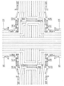 開放型人行道115進(jìn)入路口前讓位于電動(dòng)車道。縱向電動(dòng)車道301人行道302位于兩端路面橋上的橫向掉頭車道與縱向高架車道的中間,兩端分別穿越右轉(zhuǎn)彎車道(高度以電動(dòng)車行人順利通過為宜)。人行道出入口107、108跨越電動(dòng)車道,人行道出入口107-108之間(橫向)為地下通道穿越各縱向車道(高度以電動(dòng)車行人順利通過為宜)。電動(dòng)車道出入口109-110之間(橫向)為地下通道,穿越人行道入口107、108和各縱向車道(高度以電動(dòng)車行人順利通過為宜)。