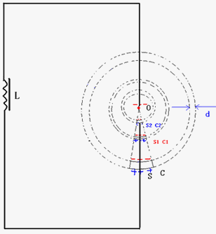 如圖3,在一個(gè)由“點(diǎn)電極”O(jiān)與“球冠電極”S組成的“球錐空間”中,如果O與S之間產(chǎn)生了足夠的“特高電壓”,那么這個(gè)“球錐空間”就可以被“雙向激擊”,依次連續(xù)發(fā)生“球冠振蕩”……、S2、……、S1、……、S,產(chǎn)生不同頻率的“電磁波”,并且呈“嵌套球狀”分布,由外到里即由球冠S到點(diǎn)O,產(chǎn)生的“電磁波”的頻率越來(lái)越大。由外向里,由球面向球心,產(chǎn)生的電磁波的頻率可以從“可見波”頻率,逐漸增大,有的可以達(dá)到紫外線頻率、X射線頻率,甚至出現(xiàn)伽馬射線頻率。[3][4]