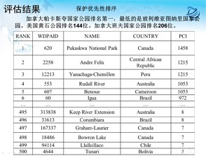 如圖所示,最后一排PCI的值最高達(dá)到1000多,最少只有5,加拿大帕卡斯夸國(guó)家公園排名第一,最低的是玻利維亞圖納里國(guó)家公園。美國(guó)黃石公園排名144位。加拿大班夫國(guó)家公園排名206位。